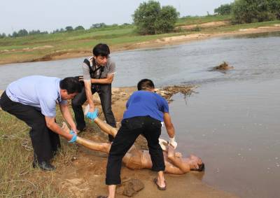 7月26日下午,4名青年男子来到孝昌县开发区双桥村泵房,附近河段的滚水坝处下河冲凉,1名男子滑落深水区失踪。27日下午16点30许,失踪男子的尸体被发现并打捞上岸。该县开发区双桥村村民张楚华告诉记者,26日下午14点19分许,他正在泵房附近钓鱼,见4名操外地口音的青年推着一辆轻便自行车来到河边,车篓里装着个游泳圈。4名男子脱了衣服,先后从被洪水淹没的滚水坝处下到河中。张楚华见水流湍急,连忙提醒:”危险,下面水很深,赶快起来!”可几名男子没有理会他。这时,走在前面的男子脚下一滑,”扑通”一声落入深水区,张楚华和村民张敏等人边用手机拨打110报警,边冲过去救人。等张楚华等人赶到坝下,落水青年已经不见踪影。另外3名青年见状,忙穿上衣服离开了现场。孝昌开发区派出所民警和孝昌消防中队官兵,接到报警后迅速赶到现场,多方打捞无果。27日下午16时30许,失踪者尸体在滚水坝下游浮了起来,2名消防战士将死者尸体打捞上岸。目前,孝昌警方正在查找死者身份。宋俊初摄