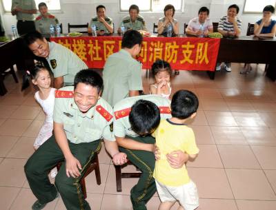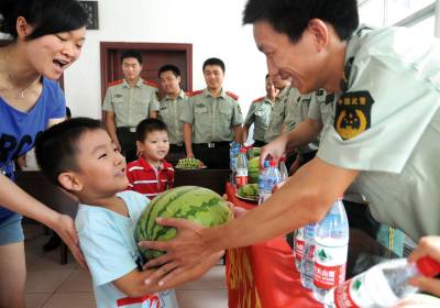 警民同乐庆”八一”27日,黄石市政府机关幼儿园、钟楼社区与武警消防路中队的官兵开展警民同乐庆”八一”活动。幼儿园为消防官兵送来矿泉水和西瓜等消暑慰问品,还和消防官兵共同表演了文艺节目。图一:幼儿园的小朋友在老师的带领下为消防官兵送西瓜。图二:幼儿园的小朋友与消防官兵正在进行”抢凳子”游戏。黄石市黄石日报摄影部邱孝威摄电话:13807232603邮编:435002