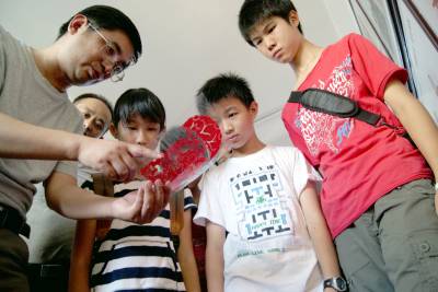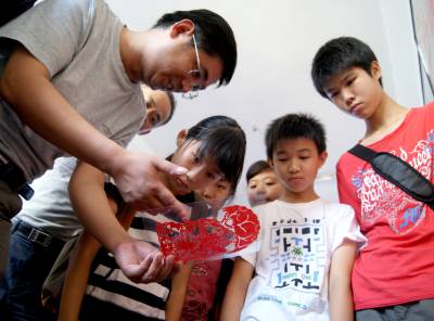 昔时百姓窗前物今朝非遗册上花。7月27日下午,11岁的台湾小朋友万家琳和4个同伴在孝感学习剪纸。她们看着《百凤图》、《花引蝶》、《槐荫记》等系列剪纸作品,并发出阵阵惊叹:”太神奇了,我们也要学着剪。”李文勇摄