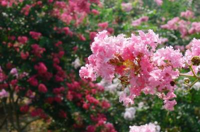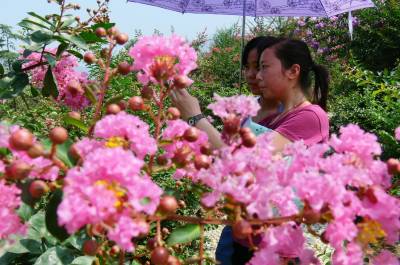 7月28日,保康县紫薇林2000多株紫薇花姹紫嫣红、争奇斗艳,吸引了众多游客前来赏花游玩。保康紫薇林位于保康县城东坡,总面积180亩,园内汇聚古桩紫薇精华,有红薇、银薇、紫薇、白薇等7个花色,是我国最大的紫薇专类园林。保康县是古桩紫薇发源地,现有原始与栽培的紫薇九千余公顷五十余万株,其中五百年以上的古蔸就有万余株。