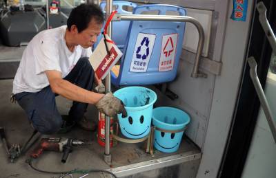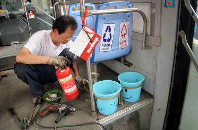 安装回收装置昨日,襄樊市公交三公司利用车辆报废零件,在一辆511路公交车上试装垃圾回收装置,并在回收桶上方悬挂意见薄,希望乘客提出好的建议,一旦乘客满意,将在其他公交车上推广安装这种环保的垃圾回收装置。谢勇摄