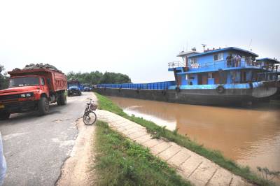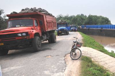 防洪物资上大堤:昨日,汉川市装满石料的卡车排在汉江大堤上,为迎战到来了汉江特大洪峰,该市不仅布置数千军民严防死守,还备足各类防汛物资以防不测。(记者曲河摄)
