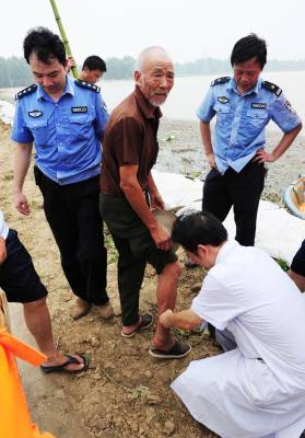 28日,潜江市王场镇吕垸村76岁的大爷聂光贤在家中被毒蛇咬伤,正在参与防汛转移群众的市公安、消防战线的干警、官兵和邻近的高石碑镇卫生院的医护人员,乘坐冲锋舟前往家中为老人作医学处理后将老人送往高石碑镇卫生进行治疗。当日,汉江最大洪峰顺利通过潜江,全市8500余人坚守在防洪一线。本报视界网吴燕军通讯员陈群摄