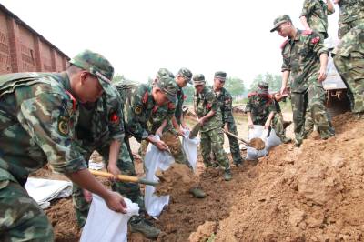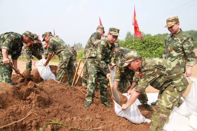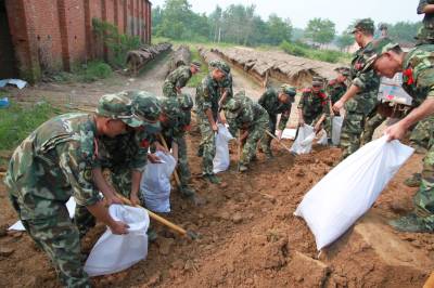 > 武警湖北总队一支队官兵填装土袋保洪峰安然过境