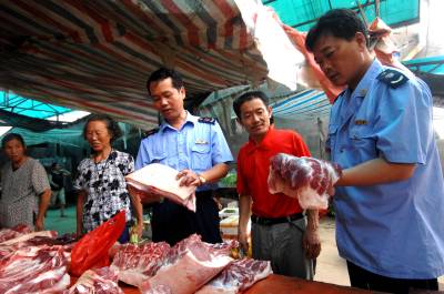 确保灾区群众健康消费29日,咸宁市工商局执法人员在咸安区马桥镇农贸市场检查肉类食品。针对夏季和汛期食品消费特点,该市工商部门加大灾区市场巡查监管力度,严查病死、淹死的牲畜、家禽及其它产品上市交易,杜绝水淹、腐烂变质、有毒有害食品进入市场销售,确保灾区群众日常生活消费安全。袁灿摄