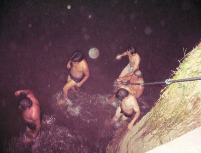 7月28日19时30分,孝昌县白沙派出所接110转警,在该镇西边老桥桥墩下,有一下河游泳的小伙子被上涨的河困住,随时都可能有生命危险。接到转警后,该所所长朱海涛,民警万力等人迅速赶到现场,发现该镇男子(金某,20岁左右)困在被洪水冲毁的白沙老桥中间。在上涨的洪水中,金某用双手死死抱住一块露出水面的石头,随时都可能被冲下去。由于河面太宽,流速太急,又没有救生衣,游泳过去危险性太大。民警们都十分着急,必须尽快将其救起。正在危机时刻,该镇群众陈中乔、陈功军、陈功兵3人拿着绳索赶了过来。2群众和3名民警通过打结的绳索,从桥面下到桥墩处后,再抛出绳索将金某救上了岸。宋俊初张亮摄