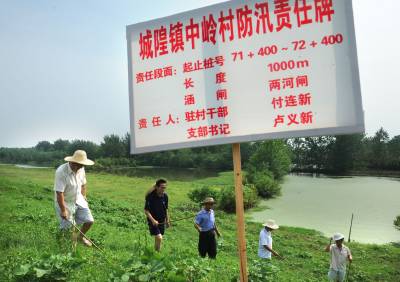 坚守大堤不不松懈:29日,汉川市城隍镇中岭村群众顶着高温巡堤查险。28日汉江洪峰安全通过该市后江水缓慢下降,全市干群不麻痹、不松懈、不厌战,坚守大堤,防止在洪水消退水中大堤出现险情。(记者曲河摄)