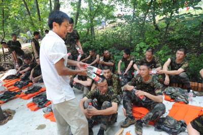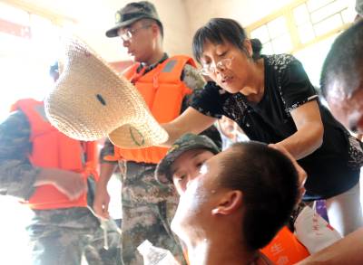 抗洪中的鱼水情:汉川市汉江段超保证水位后,2000多解放军、武警官兵开赴各险段,冒高温,顶烈日、筑子堤。子弟兵的抗洪精神感动了群众,干群纷纷为子弟兵送去降温用品。图1:私企老板将降温用品送到大堤旁。图2:群众买来矿泉水送到战士手上。图3:群众将中暑的战士抬到自己家里,为战士扇风驱热。(记者曲河本报视界网刘重庆摄)