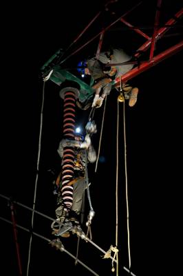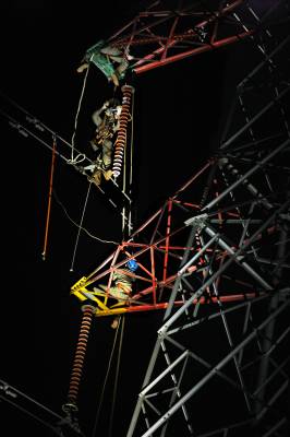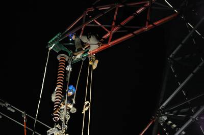 7月28日晚21点35分,咸宁供电公司抢修队员在40余米高的输电铁塔上抢修遭雷击的输电线路。当日下午,220千伏咸乌线Ⅰ回线路遭连环雷击跳闸停运,湖北电网紧急投运220千伏咸乌线Ⅱ回线路向武广高速铁路供电,同时,湖北咸宁供电公司派出30余名抢修人员巡查故障。经连夜突击抢修,遭连环雷击的220千伏咸乌线Ⅰ回线路15号、16号铁塔B相绝缘子整串闪络烧伤的故障被排除,当晚22时16分,该线路恢复运行,武广高速铁路的供电畅通无阻。