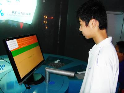 【罗超】世博园俄罗斯馆里,一台测辐仪引起了游客的兴趣。这台仪器,能够测量出每个人感知外界环境对身体的辐射值。据悉,男性数值稍微比女性的高,男性在3000左右,女性在2000上下,最高不能超过10000,都属于正常范围。襄樊中学生小宝的测量值2881,在正常范围之内。图为小宝同学在俄罗斯馆正在接受测辐仪的检测体验。