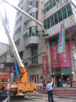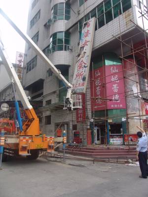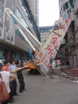 30日上午,市城建监察支队机动大队利用升降车依法对位于张湾区中商百货旁一设置在五楼的大型广告牌进行了拆除,(如图)据了解,此牌设置不规范,没有经过审批。此举标志着市城监支队对城区高层户外广告牌的治理工作正式开始。下一步,还将对城区30余处高层广告牌进行拆除。据悉,为了以靓丽市容迎接第四届世界传统武术节在我市的召开,市城建监察支队机动大队加大了对城区户外广告及店面招牌的规范管理,对破旧、残损、影响市容市貌的户外广告牌、店名招牌依法予以拆除。半年来,拆除户外广告82块4400㎡,墙体广告19块2970㎡,规范设置店名招牌679块,下达限期整改通知书1046份。拆除店名招牌545块7827㎡。拆除残旧破损影响市容的横、条幅2493条,先行保存落地灯箱325块。