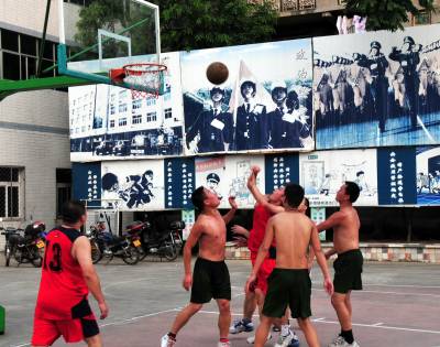 7月30日下午,湖北省郧县地税局与消防大队兰球队员正在消防大队兰球场进行激烈的兰球比赛,这是郧县地税局与消防大队军民共建多年来的传统节目,共庆建军83周年.图为地税局的税官与官兵们正在比赛时的情景.周家山陈卫东摄湖北省郧县城建监察大队地税局电话13872840078邮编442500