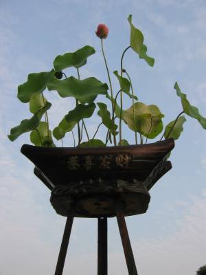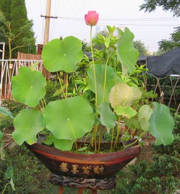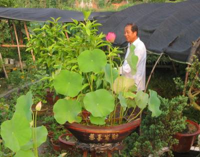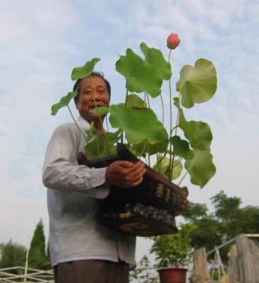 盆景荷花竞风流如今,盆景荷花成为云梦城乡居民的新宠。在农村,农民用被淘汰了的大小水缸用来栽种莲藕,即可收获莲藕,又可观赏荷花,还可在荷花缸中收获泥鳅鳝鱼,真是一举多得。在城镇,一些市民利用水缸、水桶、花盆等栽植莲藕,观赏荷花。7月31日,云梦城关居民王水明在盆景园整理自家栽植盆景荷花,他家栽植的荷花盆景大小有20多盆。