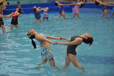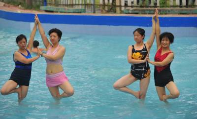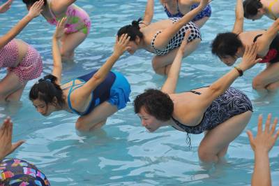 7月31日,襄樊市的瑜伽爱好者在游泳池内练习”水中瑜伽”。当天,襄樊一群爱好瑜伽运动的女性相约游泳池,结合瑜伽的基本动作在水中锻炼,享受清凉,放松身心