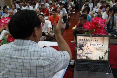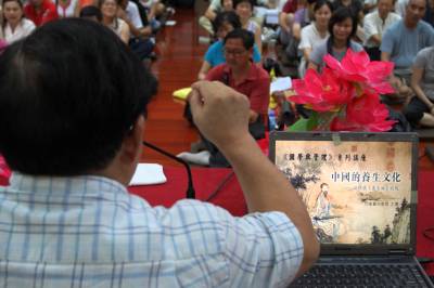 2010年7月31日,湖北武汉,美国哥伦比亚大学博士、台湾政治大学中文系教授唐翼明现身武汉归元正藏图书馆,为市民讲解中国古代养生文化。唐翼明认为,中国养生文化渊源于三国魏晋,而曹魏时期的稽康是中国古代养生文化的创立者。嵇康的《养生论》是中国最早系统论述养生的著作,对中国古代的养生文化影响极深。嵇康的养生观可以概括为5个要点:一是生可养;二是养生要养神;三是养生要养形,吃药可以养形;四是慎微,即养生要一点一滴地做起,要慎微如注;五是兼养,即要从各个方面养生。唐翼明认为,中国传统文化的精髓完全可以用10个字来总结:天人合一、内圣外王、中庸。”天人合一”就是承认人是自然物中的一员,人与天地、与周围环境要相协调。”内圣外王”实质就是要不断提高自己的修养水平,努力达到圣人的境界,从而把社会治理得井然有序。”中庸”,即主张调和矛盾,使系统保持一种最佳状态,即系统的稳态。