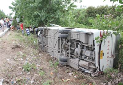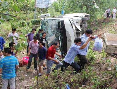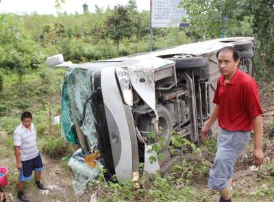 奇瑞突然拐弯武汉客车避让冲下路基侧翻 23名乘客2人伤势较重