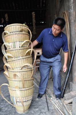 小背篓大生活 8月1日,忙过农活的恩施土家族苗族自治州宣恩县李家河乡头庄坪村农民田远木又忙于编织小背篓。该村的花背篓既是商品,又是珍贵的艺术品,引起了顾客的及大兴趣(图一)。妇女、老人也不闲着,帮助编织背篓系(图二);由于村里编织的背篓远近闻名,畅销重庆、四川、广西等地,(图二)经纪人上门到五组田远付家验货收购。 头庄坪村是宣恩县有名的”篾匠”村,村里80%以上的青、壮、老年人都会伐篾编织背篓、箩筐、筛、簸箕等。他们常忙完农活后,就坐在家里从事篾编工艺,一般一个青壮年一年利用农闲时可编织花背篓篾200多个,每个销售价80--100元,年收近20000元。 宣恩县李家河乡头庄坪村编织花背篓以成为村里的一个艺术品牌,村里的青壮大农民不需外出打工就能在自己的家门口就业,他们还可以农忙时务农,农闲时务工,既能照看到了家庭,又能找到一笔丰厚的收入,是一个不可多得的创举。视界网陈开银摄 联系:宣恩县李家河乡政府陈开银 电话:15027217539