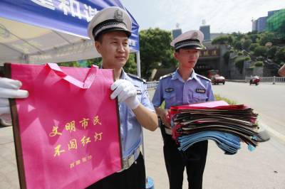 不闯红灯奖环保袋8月2日,宜昌城区云集隧道十字路口,交通民警手持”不闯红灯”环保袋,对文明过马路的行人发放。针对胡乱横穿马路的现象,宜昌市西陵交警部门制作了一万个写有”文明市民、不闯红灯”字样的环保袋,在各十字路口现场奖励给文明过马路的市民,效果不错。本报视界网黄翔摄