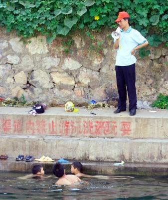 昨日下午,荆门市东宝区龙泉街道白山社区志愿者沿城区四干渠段巡回”喊水”,提醒在此玩水的人们,注意安全。据介绍,每年四干渠段都发生过溺水事件,为减少悲剧发生,社区志愿者们将不定期的宣传,提高人们对涉水安全的认识。