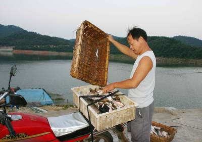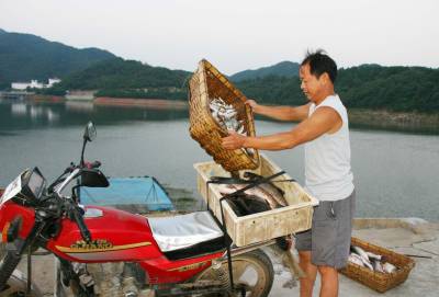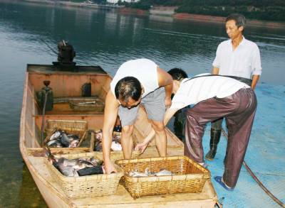8月3日一大早,孝昌县观音湖风景区汤砦村一汤姓老农刚将船停到码头边,早已等候在此的2名景区农家乐老板,就将其船上所有的鱼卖光了。一农家乐老板说,观音湖的淡水湖鱼不放料、不放药、不放肥等,鱼儿靠食野草、水中小动物和微生物等有机食品生长,味道十分地道纯正,很受食客热捧。宋俊初摄