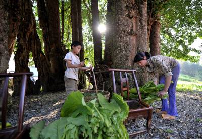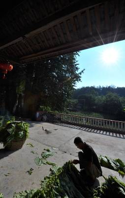 3日,住在宣恩县珠山镇茅塘村的一棵古银杏树边的农民在打理自家的烤烟。据专家介绍,这棵古银杏树树龄有1500年以上,母树遭雷击后,树干四周生长出17株高20-30米的”小树”将母树团团包围,当地人称之为”九子抱母”,树的胸径约6米,树基围径约18米,堪称”独木成林”,被专家称为”中华银杏第一奇观”。本报视界网宋文摄