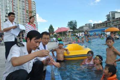 利川加强游泳池水质监测确保”游客”安全8月3日,利川卫生监督局、疾控中心工作人员正在城区一家游泳池取样监测水质。今年暑假,该市气温创历史新高,城区三家游泳池客人骤增。该市卫生部门加强游泳水质监测,对场所卫生实行踪管理,确保”游客”安全。