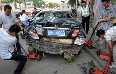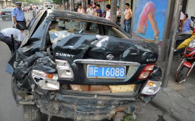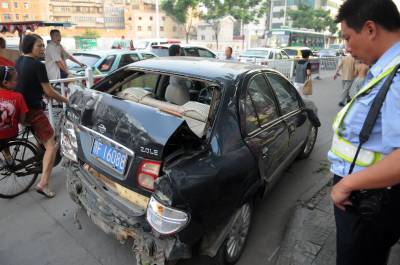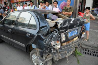 (这个世界太疯狂·酒后驾车撞南墙)8月3日,襄樊市樊城金桥家园小区一市民酒后驾车,在自家小区内疯狂乱撞之后,又闯入长征路的人行道,最后被交警及时控制。因为小区内居民和街上行人躲避及时,幸未造成人员伤亡,据悉,酒驾司机已被警方控制。谢勇摄