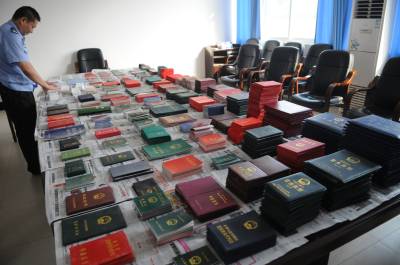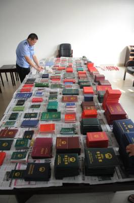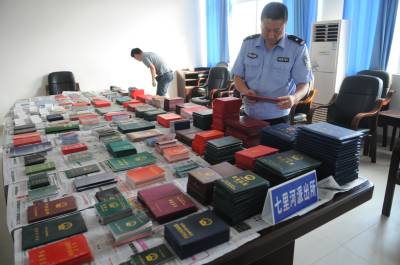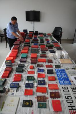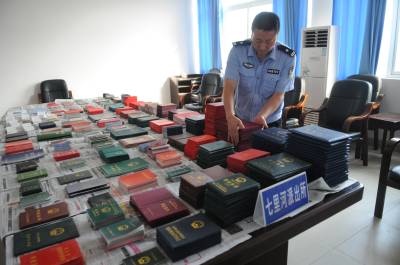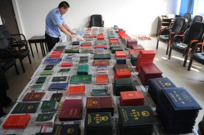 8月3日,在襄樊市高新区七里河派出所,民警们用了半天时间,清点登记了1647本各类假证,以及一些假发票和图章。2日,该所民警经过侦查布控,在春园路抓获一制贩假证嫌疑人,并顺藤摸瓜,端掉一制贩假证窝点。谢勇摄