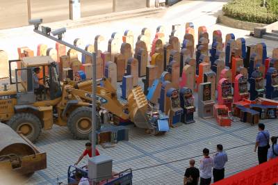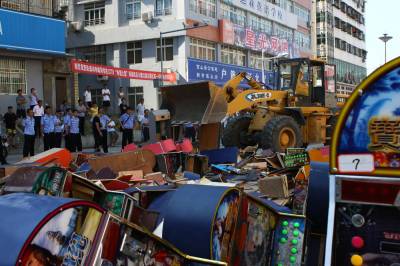 8月4日上午8时,随着一声令下,集中在京山县新市镇城区三角洲广场上的186台赌博机在碾压机的轰鸣中被集中销毁。这是该县警方开展了打击游戏机赌博的专项行动以来的又一次集中销毁。为维护城区社会稳定、为省”十三运”胜利举行营造良好的治安环境,针对部分学生沉迷于利用赌博机赌博的治安实际状况,该县警方开展了打击游戏机赌博的专项行动。坚持”露头就打”的原则,叫响”举报有奖”的口号,坚决实行”三个一律”;即涉赌游戏机场所一律取缔、涉赌游戏机业主一律拘留、涉赌游戏机一律收缴;采取”发现一台扣押一台,举报一起查处一起,收缴一批销毁一批”的措施,从重打击利用赌博机赌博行为。视界签约摄影师李凯通讯员常诗韬摄