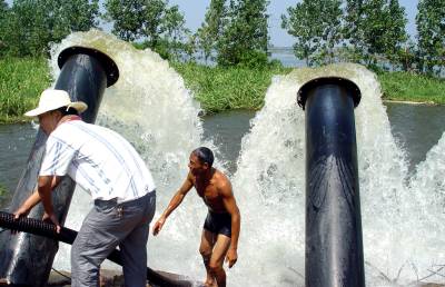8月4日,鄂州市梁子湖区沼山镇东井村,10台大功率电排站在日夜抢排渍水,以及早进行生产自救。