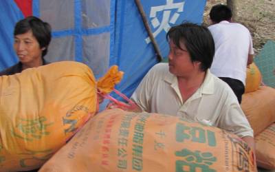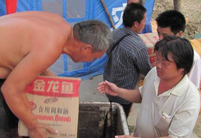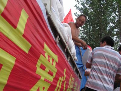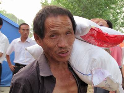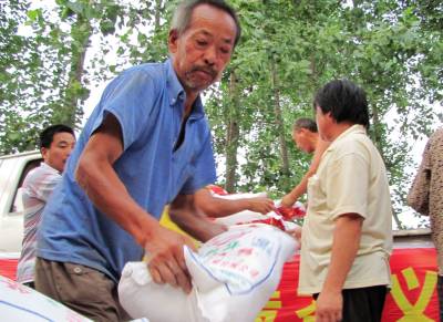 8月2日下午,郧县谭山镇孝义村受灾群众正领取救灾物资。受7月24日来自陕西洪峰突袭,该县谭山镇孝义村遭受百年不遇洪涝灾害,房屋被淹,农田被毁。郧县教育局得知灾情后,自筹救灾物资运往孝义村,为受灾较为严重的66户群众每户送去米、面各一袋,食用油一壶,同时送去衣物2000余件。