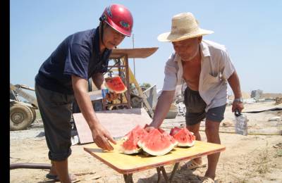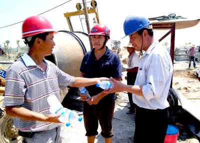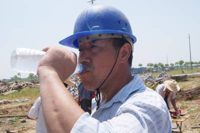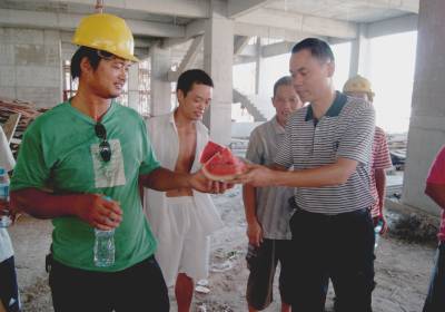 道一声辛苦,送一份清凉。4日,孝感城区湖北鹏程建筑公司工地上,一线200多名农民工正在高兴地领取项目部发送的饮料、西瓜、清凉药等物品。进入高温期以来,我市各建筑工地把防暑降温物品及时发放到农民工手中,并安排农民工实行”做两头,歇中间”避高温作业法。