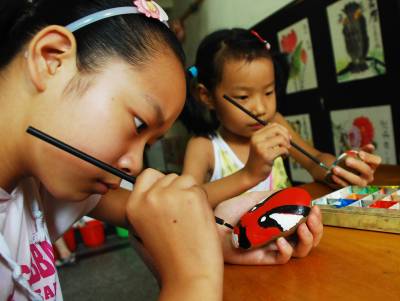 8月4日,武穴市北新村少儿书画院的学生在鹅卵石上作画。这些表面光滑,形状各异的鹅卵石,经过学生们的想像再加工,绘制出有趣的脸谱、书法作品,广受孩子们的欢迎。本报视界网刘飞摄