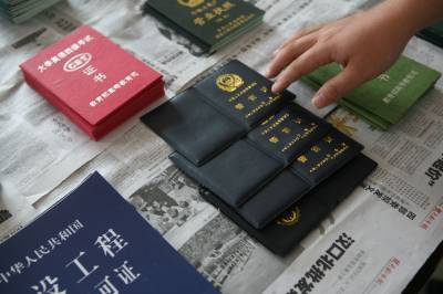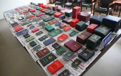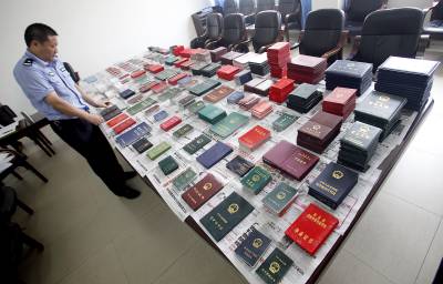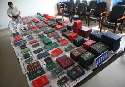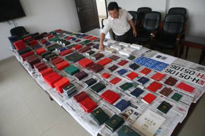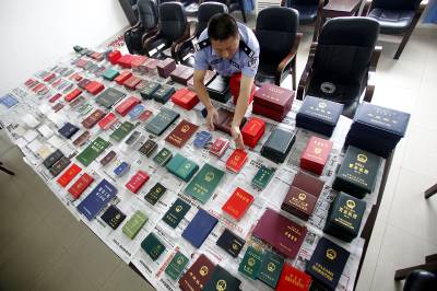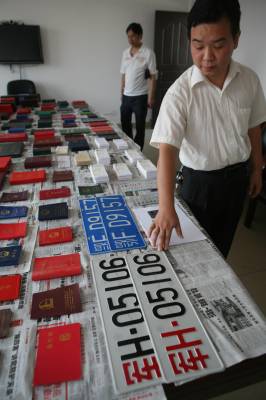 假警官证、结婚证、驾驶证、房产证、发票、车牌等应有尽有,武汉大学、湖北医科大学等院校公章想戳就戳。8月4日,湖北省襄樊市高新区七里河派出所民警经过侦查布控,在春园路抓获制贩假证嫌疑人刘某,并顺藤摸瓜端掉一大型制贩假证窝点。民警们用了半天时间清点,查获的假证有105种,共1647本。这些证件铺在地上,足有篮球场大。(若见报,作者请署:龚波闫松)