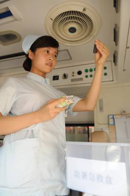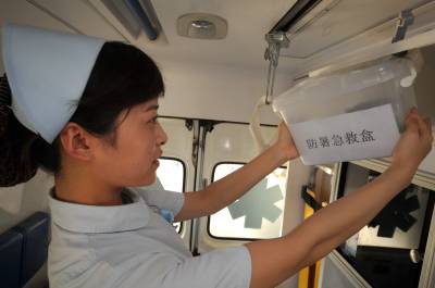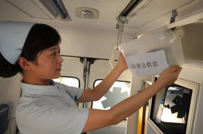 救护车专门配备防暑药箱备战高温8月4日,防暑药箱被专门配备到救护车上,以应对高温带来的突发情况。近期持续高温天气,中暑病人日渐增多,宜昌市中心人民医院急诊科为每辆救护车配备了防暑急救药箱,药箱内备有藿香正气水、速效救心丸等多种中暑急救药品,备战高温天气。图为护士吴艳丽正在整理防暑药箱里的药品,为急诊出车做好准备。