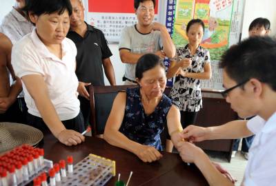 5日,医务人员正依次给村民验血。荆州市沙市区岑河原种场南桥分场是血吸虫病传播的重疫区,渍水退后,他们及时采取清沟、填埋和喷药等多种方式灭螺,同时组织众多的医疗人员到各村设检疫站,为村民免费验血,并为感染者提供及时无偿的救治。(记者杨平见习记者孙文摄)