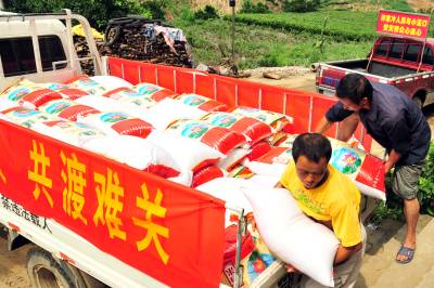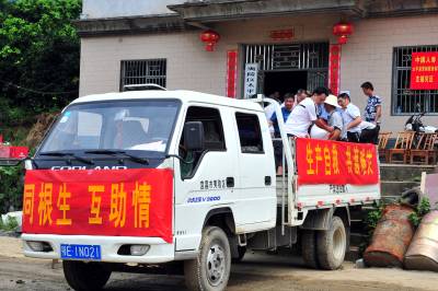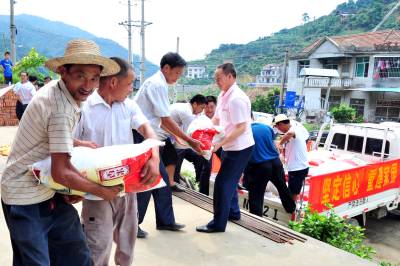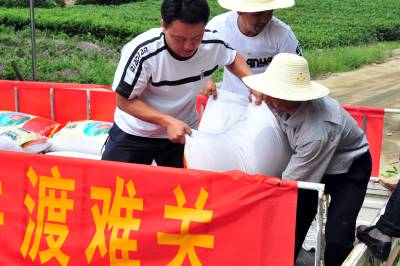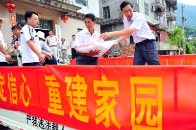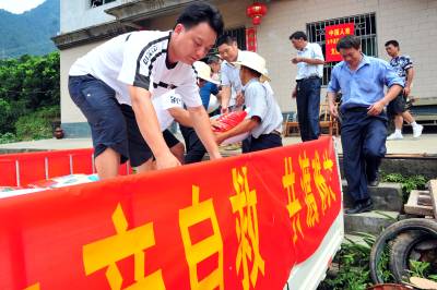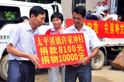 2010年8月5日,正在开展新型农民教育活动的湖北省宜昌市夷陵区太平溪镇许家冲村10多名党员干部和群众代表,来到遭受”7.23”特大暴雨灾害的重灾区小溪口村,向该村送去了村里24名干部群众的8100元捐款和价值10000元的大米,为灾区群众奉献爱心,齐心协力帮助他们重建家园。本报视界网张国荣摄