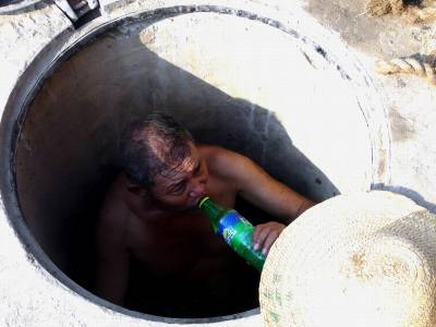 8月5日的湖北武汉,高温不减,热度不减。上午8点36分,在汉口发展大道二环线高速路施工工地现场,这位农民工在地下暗沟电缆施工清理废弃物时,又热又闷又渴,赶紧回到窨井口,喝水解渴稍徾休息。