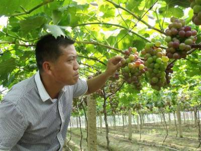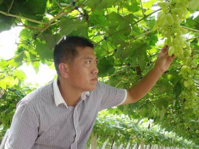 眼下正是葡萄成熟的季节,在黄梅县独山镇界子墩的小宛葡萄专业合作社的葡萄生态园里,一串串晶莹剔透,鲜艳欲滴的”小宛葡萄”在阳光的照射下如碧玉般透亮。图为小宛葡萄专业合作社理事长宛习平在查看葡萄生长态势