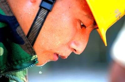 高温下,他们在坚守5日,十五冶金建设公司七公司一名员工用毛巾遮阳在黄石市重点工程谈山立交桥工地工作。连日来,黄石气温都在38℃左右,最高超过39℃。许多户外劳动者仍冒着酷暑高温坚持工作,不少部门已通过增加岗位轮换频次、增加午休时间、错时上下班等方式防止户外工作人员出现高温中暑。图二:一名在工地扎钢筋的员工流下辛勤的汗水。黄石市黄石日报摄影部邱孝威摄电话:13807232603邮编:435002