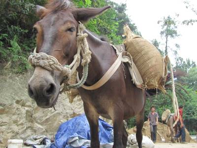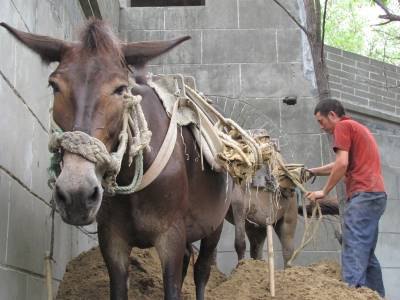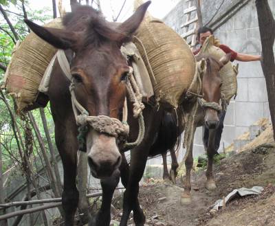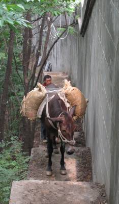 8月6日,在十堰市人民公园通往仿古长城的山路上,几匹马正驮着沙石上山。由于市人民公园仿古长城续建工程在山上进行,因山路崎岖,车辆无法通行,这些马成了运输工程材料的主力,成为城市里的特殊运输工具。仿古长城续建总长度760米,工程投资230多万元,目前工程建设已接近尾声。