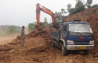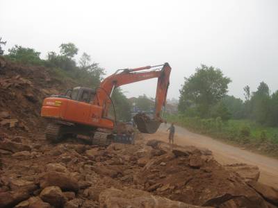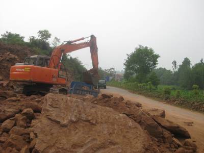 劈山开路修村路为打通一条艰巨的通村公路,8月6日,安陆市王义贞镇汝南村调集一台挖掘机和数辆卡车对众多巨石进行挖掘、搬运。图为工地繁忙的景象。签约摄影师:王代金