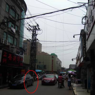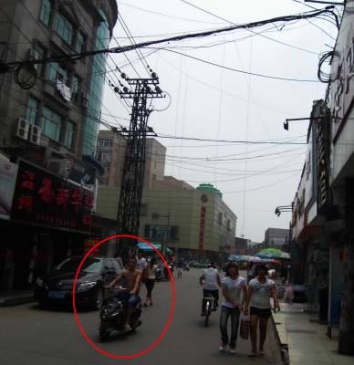 【罗超】近期,湖北襄樊樊城区定中街一条并不宽敞的马路上,两边布满了商铺,行人络绎不绝。然而就在行人的头顶上方,电线纵横交织,有的已经断裂,耷拉下来,甚至落到地面,形成了电线帘子,让过往行人望而生畏,惟恐躲避不及。图1为电线帘子下垂到地面。图2为赤膊小伙驾驶摩托车穿越电线帘子。