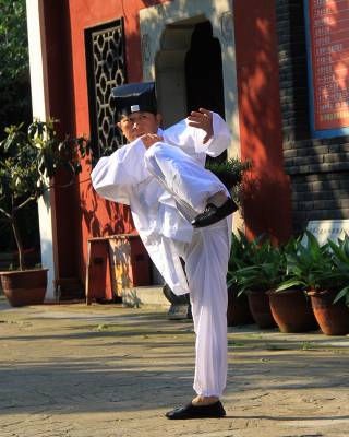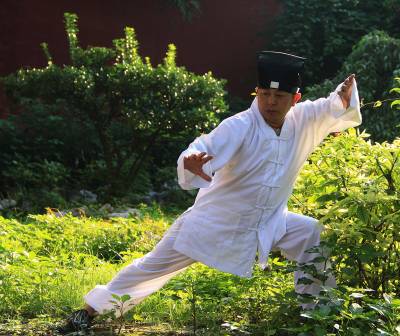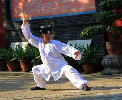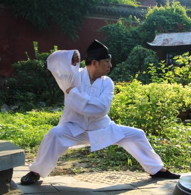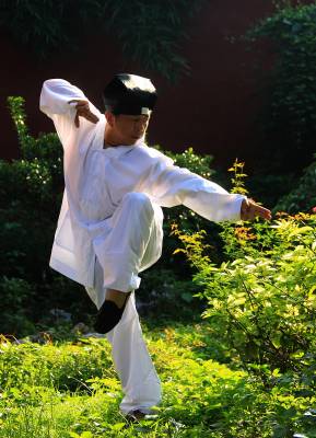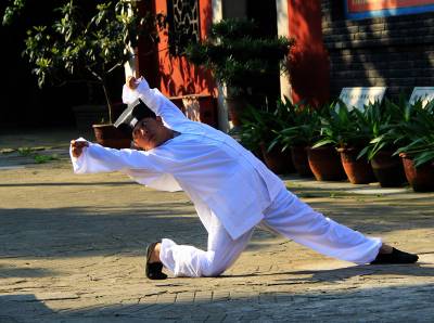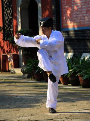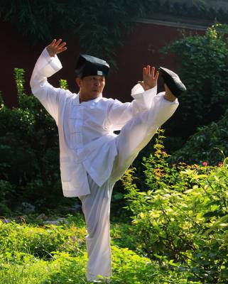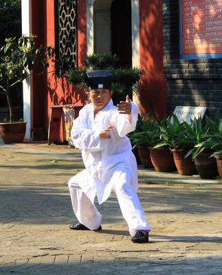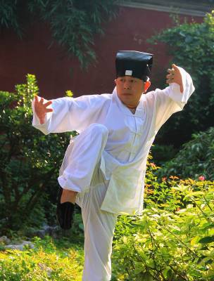 武当功夫在海内外有着广泛的影响,主要归功于当今武当武术主要传人游玄德大师。他是武术界著名武术家和道教界領袖,经常出訪美国,意大利,德国,法国,新加坡,马來西亚,印尼,韩国,泰国及香港和台湾等地,是中国著名的武术名家,武当派武术的权威代表人物。天下太极出武当,游玄德道長作为武当派创始人张三丰的嫡系弟子,在中国和世界武术界有着广泛的影响。游道长除了具有高強的武艺,深厚的文化素养,还有着強烈的爱国情操。道长博学高雅的风度、不卑不亢的待人接物方式和良好的外交素养、以及虚怀若谷的襟胸、高风亮节的品格,使道长无论出現在哪里,都会成为大型活动的中心人物。宣传科学,研究学问,学以致用,热爱祖国,尊重历史,承传文明,珍惜生命,保护生态,尊老爱幼,是宗师一贯的口头禅。宗师的一言一行,朴素而深刻,受到海內外各界人士的拥戴。无不叹服宗师在不同领域的精辟论述和赋有大智慧的远見卓识的弘道风采,被新闻圈誉为”海內外文化交流的风云人物”。图为武当派第十五代弟子蒋剑在武汉[武当会馆]表演武当武术。