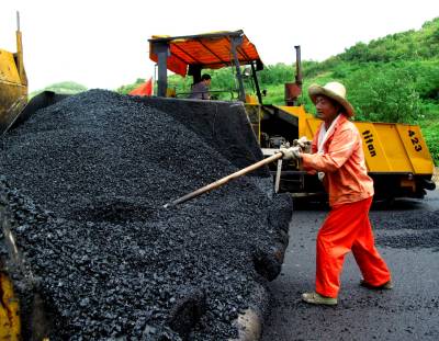 7日,在38度高温下,在150度的沥青混合料旁,一位道路刷黑工人汗流浃背也无所畏惧,仍然坚守着自己岗位。