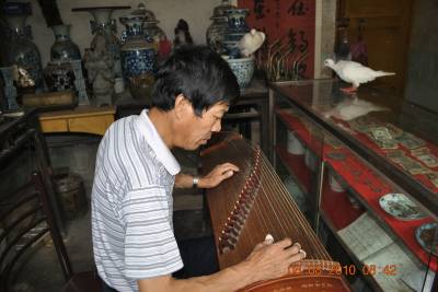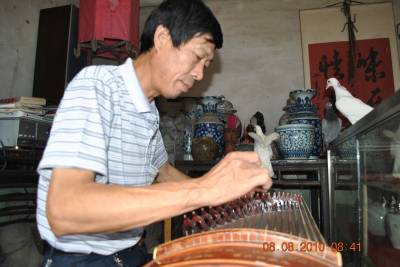 图文:古筝上的鸽子昨日(8日)上午,一首高亢的古筝《高山流水》从郧西县城”老熊古玩店”里传出,三只鸽子立即从屋外飞落在古筝上细心聆听。今年53岁的熊玉国是”老熊古玩店”的主人,空闲时间就喜欢弹弹古筝自娱自乐。据介绍,10天前一个炎热的下午,他端坐在古筝前面练习《苏武牧羊》这首古曲,曲子刚弹到一半,三只鸽子便飞落上古筝的一头,歪着脑袋听老熊弹筝,听到妙处还不时翩翩起舞。(本报视界网徐雁初摄)