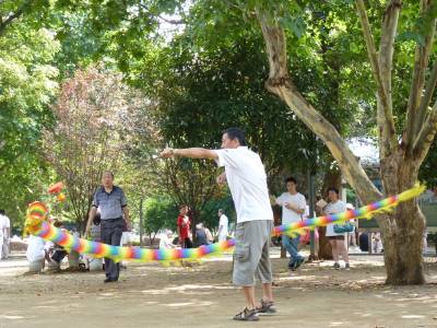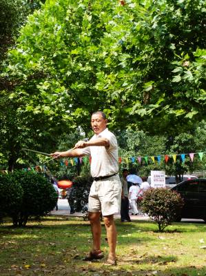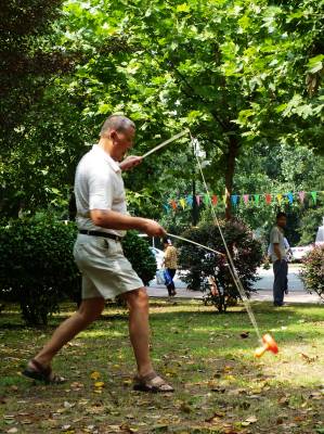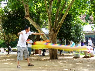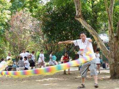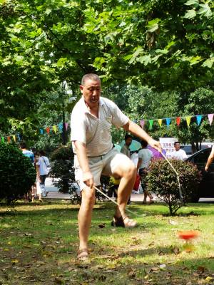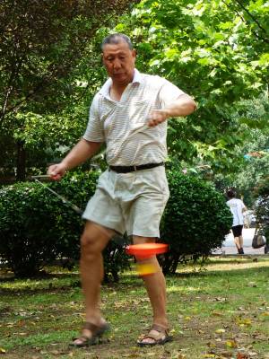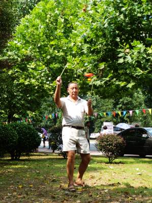 8月8日上午,武汉一位市民在汉口江滩耍起我国古老的民族体育项目——空竹。当日是第二个全国”全民健身日”,湖北省组织群众参加世界行走日等活动,展示全民健身成果。