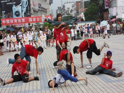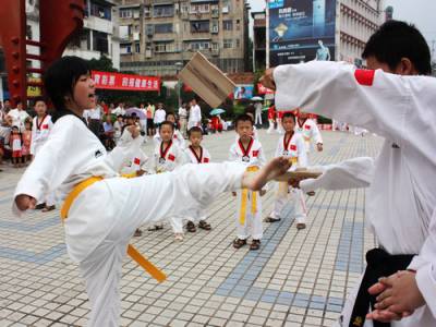 8月8日上午,在第二个全民健身日里,南漳县举办了丰富多彩的体育项目展演活动。在水镜广场,来自县老年体育队、武术馆、舞蹈班等7个体育社团表演了精彩的体育项目,上千市民观看表演,将全民健身运动引向深入。图为一女孩表演跆拳道功夫。通讯员张兴江张红梅/摄