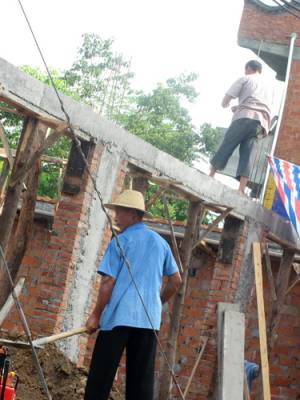 郧县倒房灾民积极重建新房(通讯员:柯常武单位:十堰市郧县安阳镇政府邮编:442515电话:15571900508)8月8日下午,郧县安阳镇西堰村的一户倒房灾民正在烈日下重建新房。7月份以来,郧县连续遭遇4场强降雨,导致1000多户3000多间居民房屋倒塌,2000多户6000多间居民房屋成为危房。县民政、财保、扶贫等部门积极筹集救灾资金,扶持倒房户重建新房,力争在9月底以前完成灾民新房重建任务。