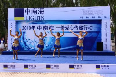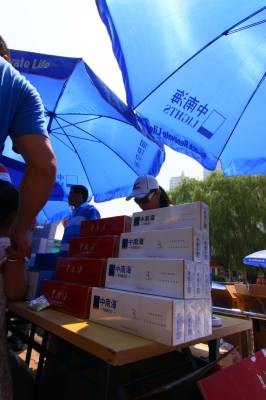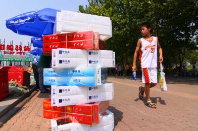 2010年8月8日,北京朝阳公园,一名小男孩从堆放的中南海牌香烟旁边经过。中南海牌香烟开展促销活动,现场出售香烟。